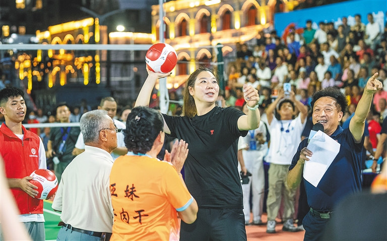 本报讯(海南日报全媒体记者刘冀冀 实习生杨梦娜)久久不见球场见。7月11日,2025年“九九杯”海南(文昌)乡镇排球联赛(以下简称“村VA”)进入“铺前时间”。绚烂漫天的烟花秀后,“村VA”迎来了一位“老朋友”——女排退役国手杨珺菁。