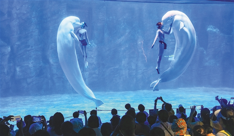 7月14日,在儋州海花岛旅游度假区海洋乐园,精彩表演引得游客纷纷拿出手机拍照录像。随着暑期旅游旺季到来,海花岛以独具特色的文旅项目,为海南暑期旅游增添活力,成为家庭游、亲子游的热门目的地。海南日报全媒体记者 陈元才 摄