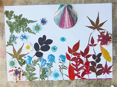 红枫叶、蓝花瓣、白贝壳、形态各异的草茎……在陵水文罗镇五星村五星小学,海南师范大学学生赵敏晗、曾婉玲将提前准备好的自然贴画材料放在桌上,立刻引起许多孩子的注意。