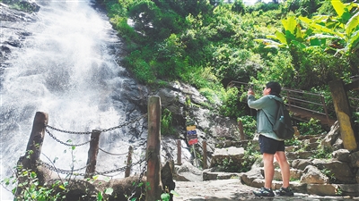 一入百花岭景区,雨林独有的清爽凉意扑面而来。沿着石阶“逆流而上”,一路听着哗啦啦的山涧泉水声,不一会儿,百花岭瀑布豁然展露真容。