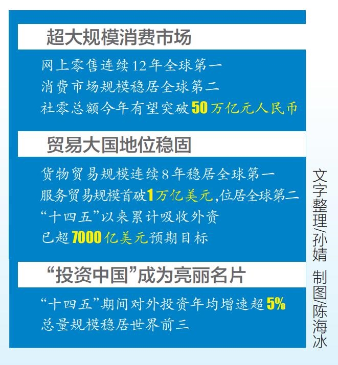 “开放”,国内外市场联动互促。王文涛说,一方面,更多优质商品服务进入中国,2021至2024年我国累计进口消费品7.4万亿元;另一方面,扩大单方面免签国家范围,组织“购在中国”活动,优化离境退税政策,2024年入境游客总花费942亿美元,增长77.8%。