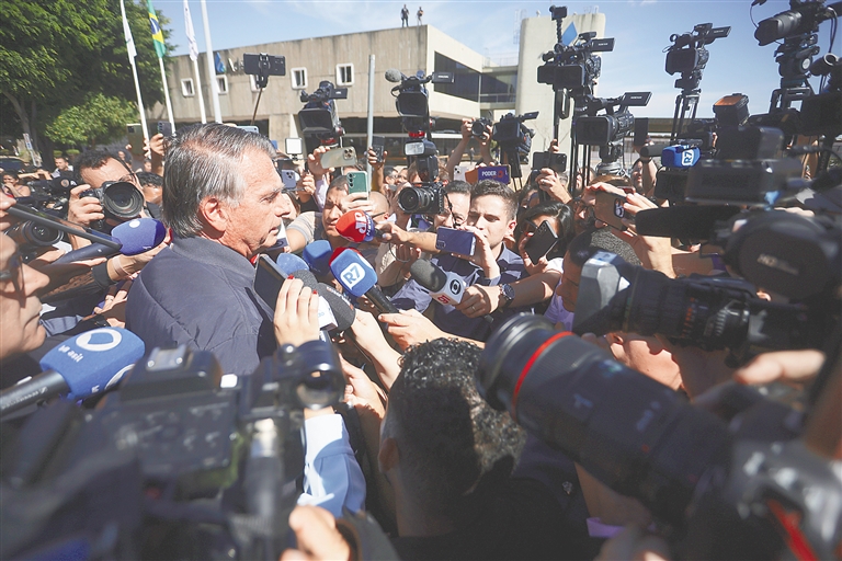 7月18日,在巴西首都巴西利亚,巴西前总统博索纳罗被记者围住采访。