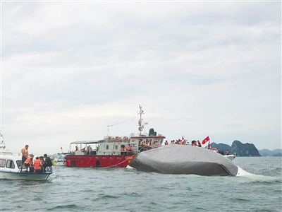 这艘游船19日在航行过程中突遇风暴而倾覆。事故发生后,广宁省有关部门立即展开救援。20日凌晨,游船已被打捞出水并被拖回岸边。目前,有关部门已扩大搜索范围,继续搜寻4名失踪人员。