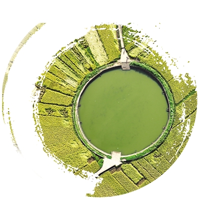 自高空俯瞰,可见大体呈圆形的38亩田洋包裹着一处约2亩的圆形池塘,形似时钟,两条水泥村道则如时针、分针般连接着池塘和外围民居。