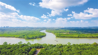 八门湾是文昌市的一处内海港湾,因区域内生长着连片红树林,被称为“绿色长城”“海上森林公园”。这个港湾因文昌河、文教河、横山河、头苑溪等八条河流、溪流汇集,八条水道形似向海而开的八扇“大门”而得名。关于其名称的由来,还有另外一种说法。2000年版的《文昌县志》记载:“文昌河和文教河汇合注入清澜港的内海港湾,状似‘八’字,八门湾由此得名。”不管是河溪水道形似八扇“大门”,还是港湾形似“八”字,八门湾得名原因都与地理形态有关。