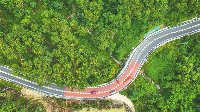 近日,俯瞰环热带雨林国家公园旅游公路儋州段,沿路风景如画,车辆穿梭其中。