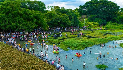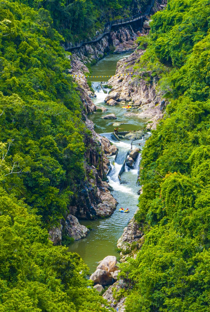 在五指山,玩法有好多种:沿着蜿蜒的盘山公路探访海南热带雨林国家公园五指山片区景区,感受林木葱茏、溪流潺潺、鸟鸣山涧;或徒步穿越桫椤丛林,聆听虫鸣鸟叫的“和谐欢歌”;或体验红峡谷漂流,在落差百米的激流中感受“清凉暴击”;也可在五指山城区,在茂密的香樟树下感受翡翠山城的风韵;或到南圣河边体验水上游船,享受清风拂面而过的凉爽。