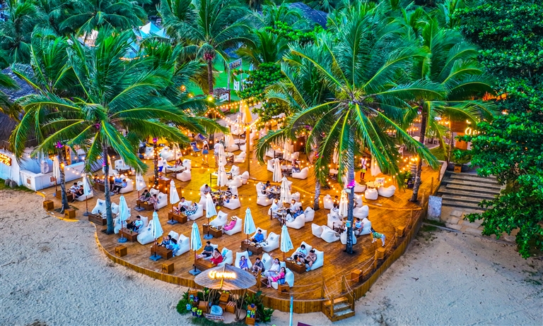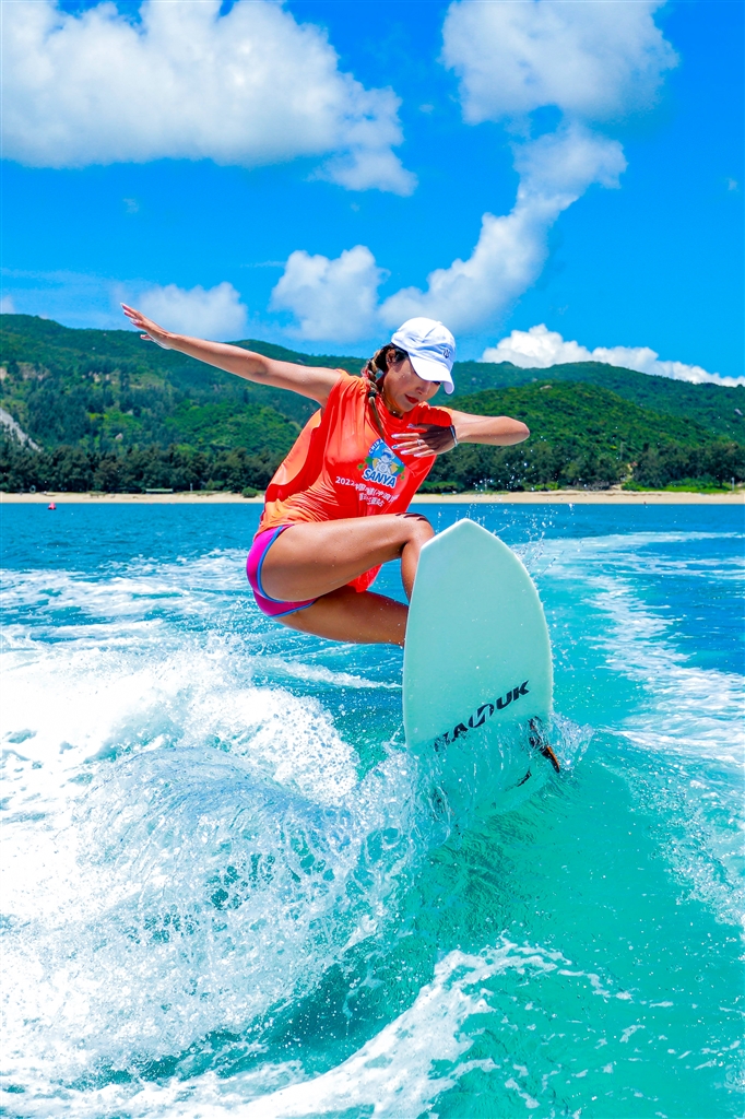 同样的场景也在万宁石梅湾发生:一只只冲浪板在海浪里忽远忽近地穿梭着,冲浪爱好者“骑”着浪头飞快移动;沙滩上,游客在教练带领下,学习冲浪的基础动作。
