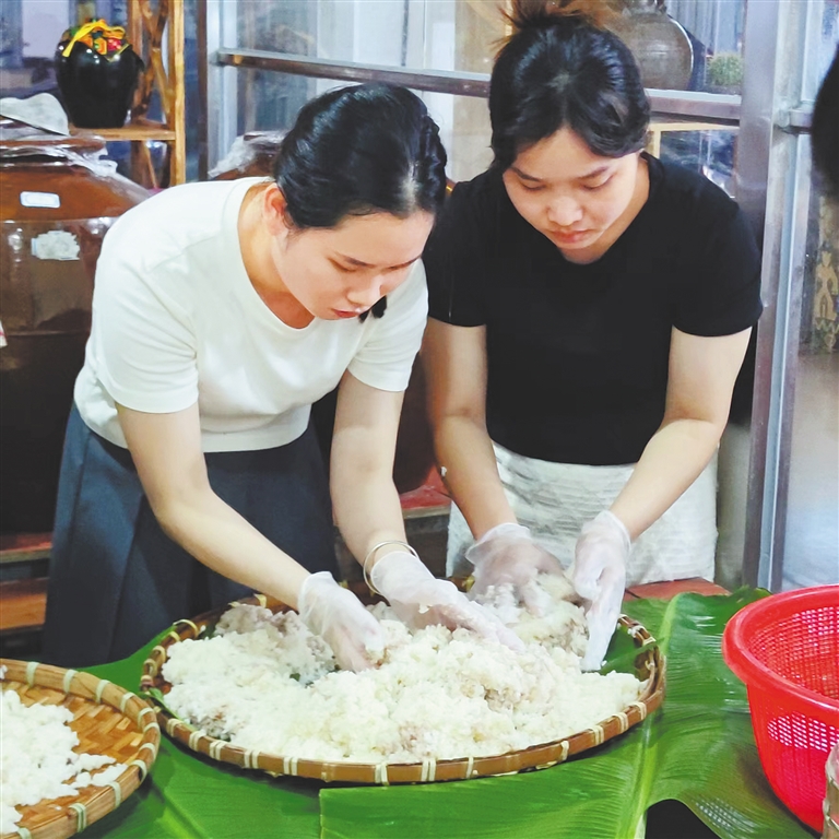 ② 在抱由镇酿酒基地,两名青年体验山栏酒酿造过程。