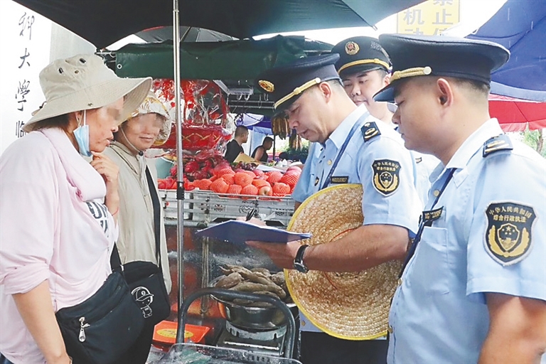 作为三甲医院,省人民医院秀英院区周边人流量大、人员密集,流动摊贩扎堆经营现象尤为突出,不仅造成交通拥堵、影响市容环境,更对急救通道造成严重阻碍。海口市综合行政执法局秀英分局打破部门壁垒,联合区营商环境建设局、城管局以及当地街道办同院方开展实地调研,通过调研,精准掌握摊贩聚集的高峰时段和重点区域,建立问题清单。