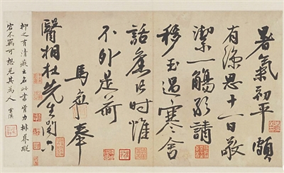 然酷暑虽熬身,友情更感人。北宋名臣傅尧俞《蒸燠帖》仅数语:“气候蒸燠,伏惟台体万福。”简淡问候诉诸端雅的楷书,品之如清风入怀。明代马愈《暑气帖》在暑退时邀友“十一日敬洁一觞,敢请移玉过寒舍话旧片时”。其笔法纵宕不羁,与友人之情谊亦如墨色清润绵长。