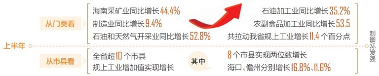 从门类来看,上半年海南采矿业同比增长44.4%,制造业同比增长9.4%;重点行业中,石油和天然气开采业、石油加工业、农副食品加工业分别同比增长52.8%、35.2%、53.5%,共拉动我省规上工业增长11.4个百分点。