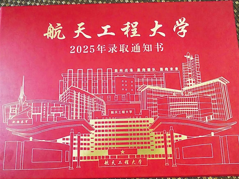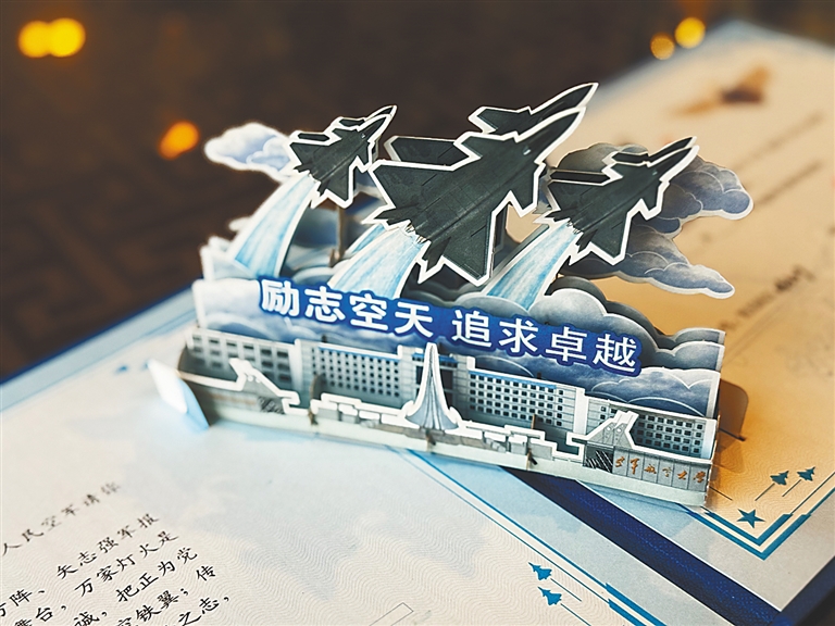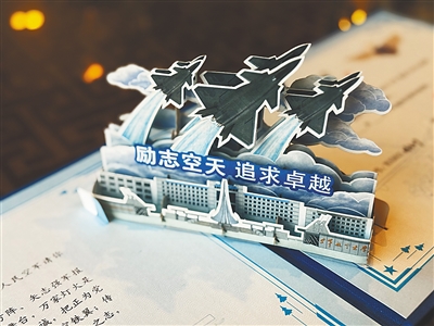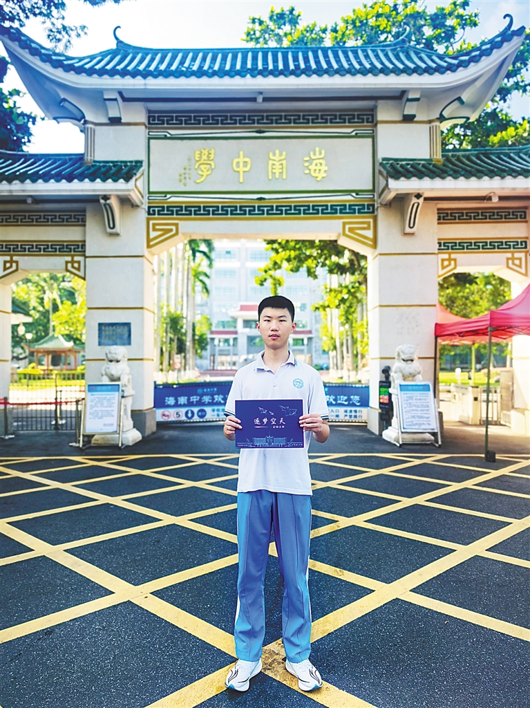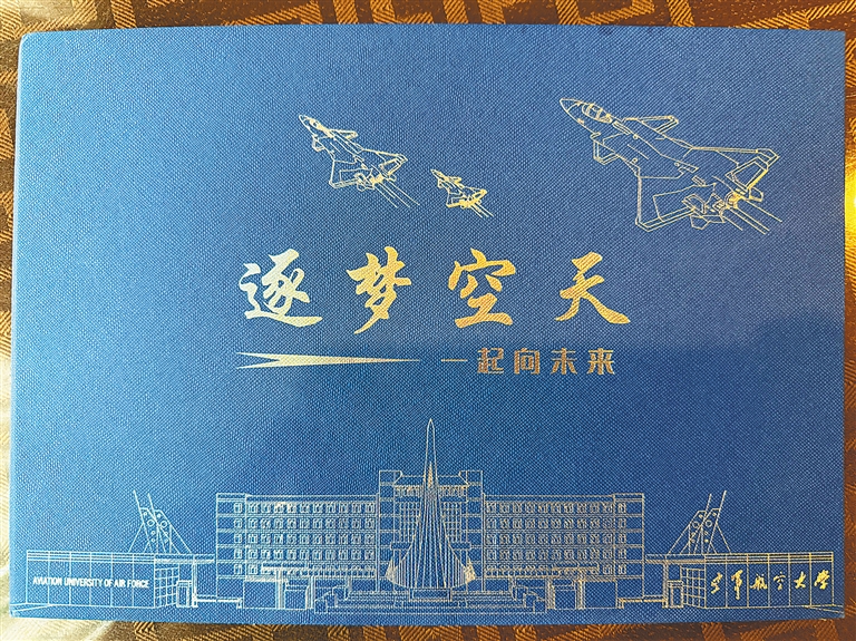 海南中学高三毕业生韩相举的手机里,珍藏着一张意义非凡的照片。照片中,他身穿校服站在海南中学校门前,手捧中国人民解放军空军航空大学的录取通知书:“逐梦空天·一起向未来”等烫金字体印在深蓝色的封面上,熠熠生辉;内页的战机立体图设计精美,气势恢宏。