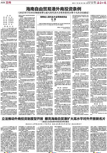 2025年7月30日,海南省七届人大常委会第十九次会议审议通过了《海南自由贸易港外商投资条例》(以下简称《条例》),共三十七条,自公布之日起施行。
