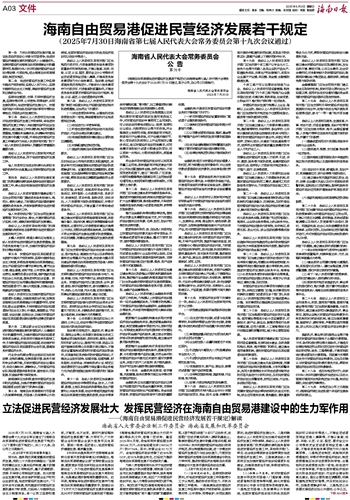 2025年7月30日,海南省七届人大常委会第十九次会议审议通过了《海南自由贸易港促进民营经济发展若干规定》(以下简称《若干规定》),共二十九条,自公布之日起施行。