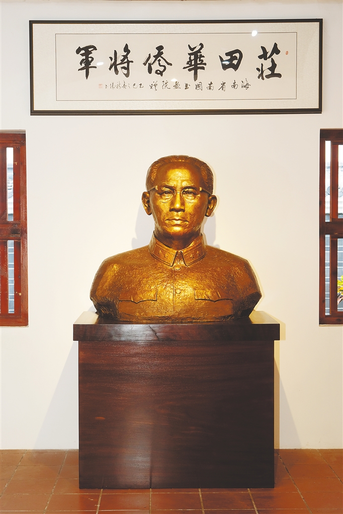 8月4日,海南日报全媒体记者走进位于万宁龙滚镇文渊村的庄田故居。故居内,前屋摆放着庄田生前使用过的两张旧木椅;后屋中央树立着庄田的半身铜像。