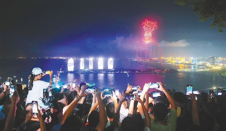 当晚,海月广场作为最佳观赏点之一,现场人头攒动,摩肩接踵。无人机矩阵勾勒出的游戏角色、海岛风光等奇幻画面,搭配绚烂花火,将夜空点缀得如梦似幻。市民游客或举着手机记录光影变幻,或与亲友欢呼互动,留下难忘瞬间。