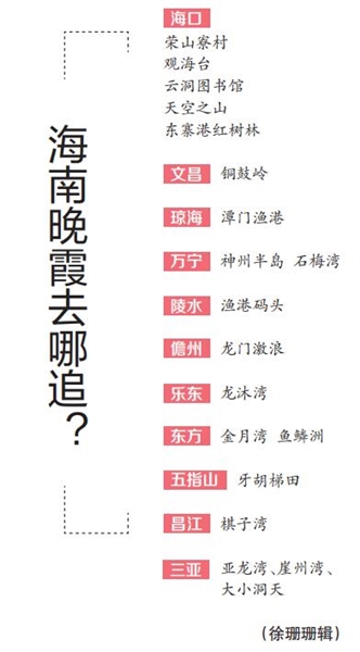 “除了海口,海南还有很多地方都有美丽晚霞。”海南省气象台首席预报员蒋贤玲介绍,沿着海南环岛旅游公路,无论是东线还是西线,你都可能邂逅漫天晚霞。例如,在海南环岛旅游公路东线,人们在文昌铜鼓岭、陵水渔港码头、万宁石梅湾等地,都能邂逅不同风格海岸线下的绚丽晚霞。