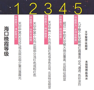 “当然,并非每一天的晚霞都格外绚丽,晚霞亦有等级之分。”陈升孛介绍,海口晚霞预报将晚霞分为5个等级。其中,1级晚霞为“清新霞光”,特点是天空中某片云泛红或云层出现少量日落霞光;2级晚霞为“治愈系晚霞”,特点为天空中某个方向出现部分浅红色或粉红色;3级晚霞为“绚丽晚霞”,特点为天空中有一个方向出现红色或金色云层,云层特征明显。