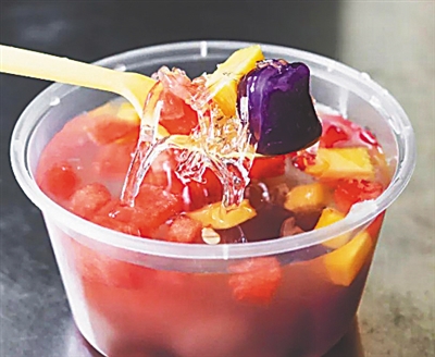 打我记事起,阿华伯的摊子就在那儿,少说也有30多年了,连顶上的篷布都已经晒得发白。听长辈们说,阿华伯年轻时是国营糖厂的工人,捧着人人羡慕的铁饭碗。后来,糖厂不景气倒闭了,他便经营起这小本生意。起初只卖绿豆汤和烧仙草,四果汤的配料也简单,无非是银耳、薏米、石花膏、仙草冻等“老四样”。后来日子好了,他的摊子也跟着“升级”,小料越添越多,已经有20余种了。