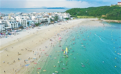 近日,游客在三亚市后海村附近海域冲浪嬉水。暑期,许多游客来到海南三亚,学习体验冲浪,感受与海共舞的乐趣。新华社记者 郭程 摄
