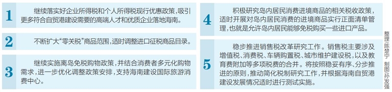 全岛封关运作后,财政部将结合海南自贸港建设实际和推进更高水平对外开放需要,继续深化税制改革,确保政策力度持续提升,政策红利不断释放。主要涉及以下五个方面: