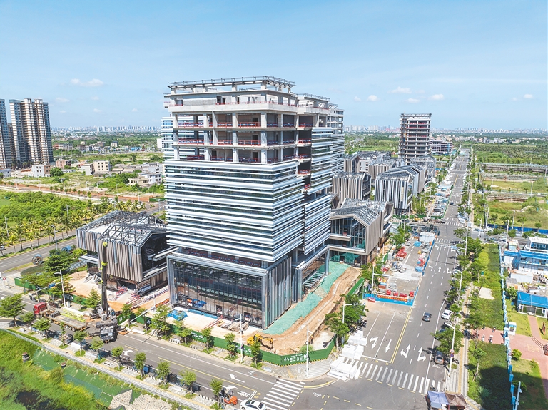8月12日,在海口江东新区的海控·江东广场项目建设现场,工人加紧开展幕墙安装、机电安装等施工作业。