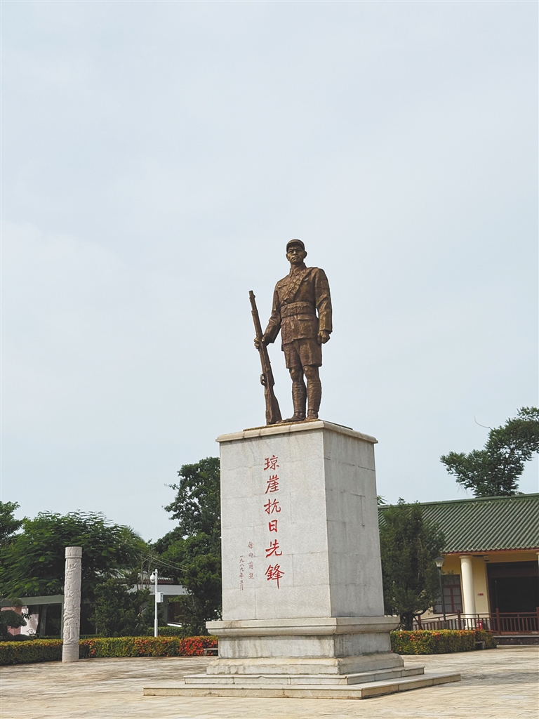 步入旧址,迎面就是一尊琼崖抗日独立队战士的全身铜质铸像,战士手握钢枪、背着弹夹,目光坚毅地凝视远方。铸像基座正面刻有徐向前的题词——琼崖抗日先锋,6个大字鲜红醒目。