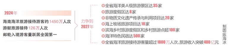 本报讯(海南日报全媒体记者刘晓惠 通讯员李艺娜 实习生劳兰婷)近日,海南省建设国际旅游消费中心和旅游市场整治领导小组印发了《海南省海洋旅游高质量发展三年行动方案(2025—2027年)》(以下简称《行动方案》)。该方案锚定“向海图强、再造一个海上海南”战略目标,明确未来三年海南海洋旅游发展路径。我省将力争到2027年,完成海洋旅游产品焕新升级。