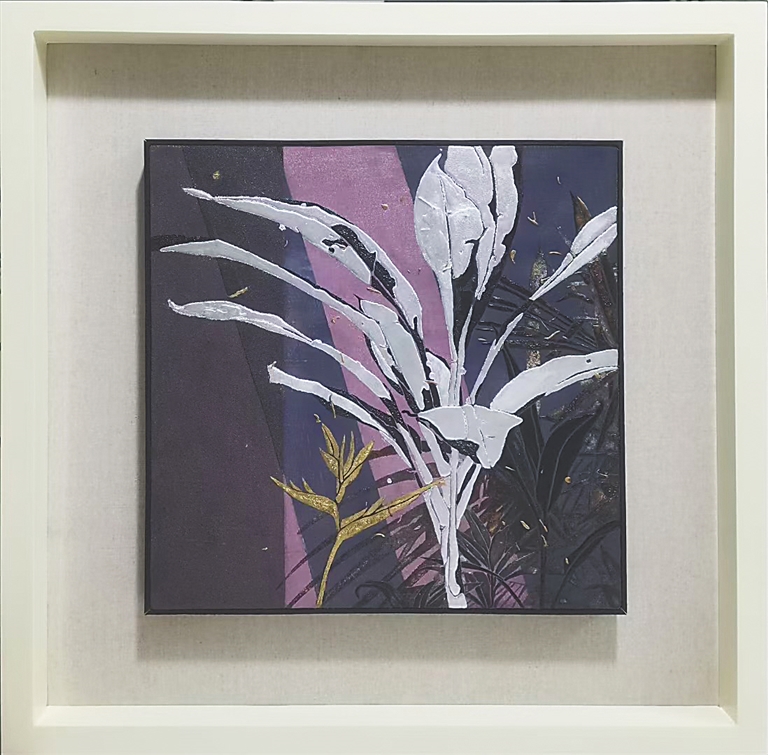 漆画作品《温暖》整体画面呈现暖灰色调,画面主体为一大一小两株植物。“大株白色植物恬静沉稳,寓意母亲、长辈,小株金色植物充满活力、生机勃勃,比喻孩子,其余暗色的植物表示一个大家庭。”吴根波介绍,整幅画表达的是一种温暖、呵护、守护的意境。