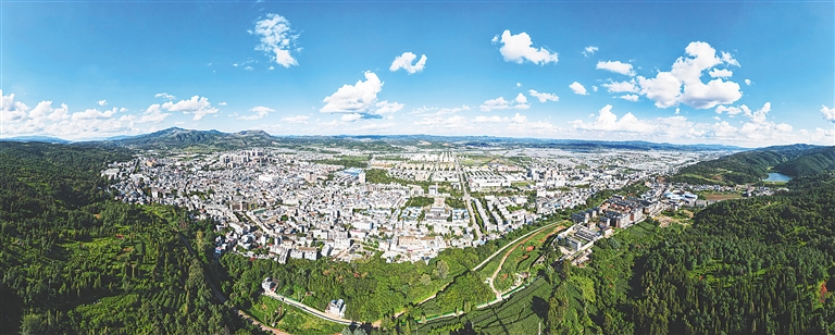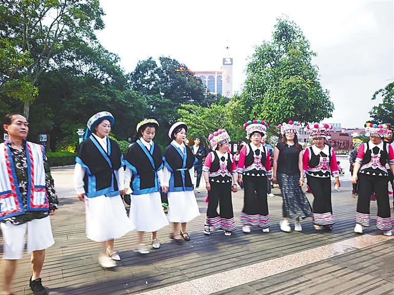 傍晚,太阳下山时,灯光将城市装扮得绚丽多彩,城里最热闹的地方是民族团结广场,除了在各地都能见到的广场舞,在广场的一角,还有男女在对唱山歌;广场中心,一群人穿着漂亮的苗族、彝族民族服饰围成圈,欢快地跳着民族舞蹈,一派快乐祥和的景象。