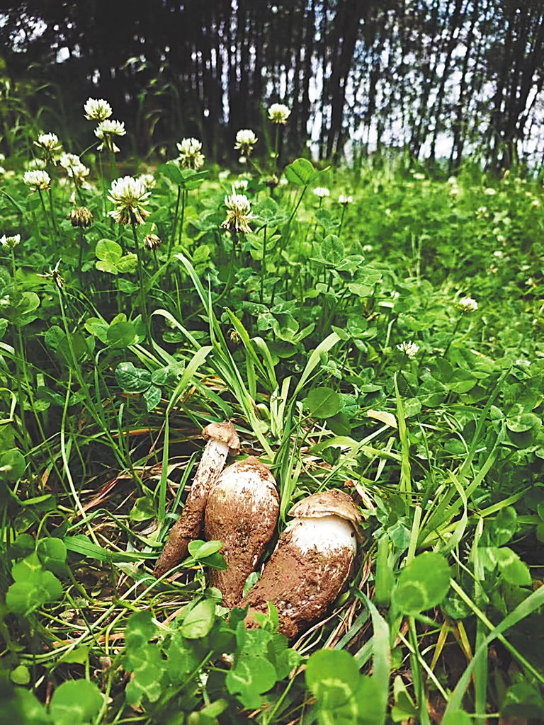 到寻甸当天晚上下了场雨,第二天一大早,当地朋友就兴冲冲地赶来带我们去离县城不远的天生桥村。穿过一块绿油油的烟叶地,进入一片茂密的松林,我们小心翼翼地弯下腰钻入林中,沿着山坡,拨开树枝和野草,搜寻野生的菌子。也许是我们早起早去的缘故,不一会儿,手中的篮子装满了大自然的慷慨馈赠。午餐时,我们便品尝到了自己劳动所得的鲜美味道。