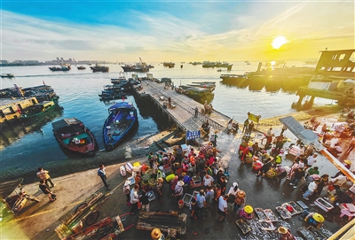 ①8月20日清晨,儋州白马井中心渔港热闹非凡,渔民们将新鲜渔获搬运上岸进行交易。
