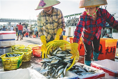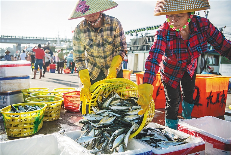 ③8月20日,琼海市潭门港渔民在码头装卸海鱼。