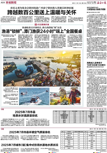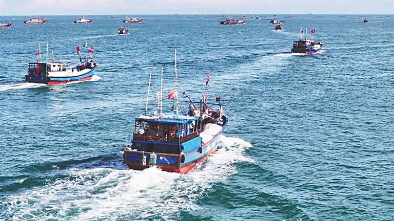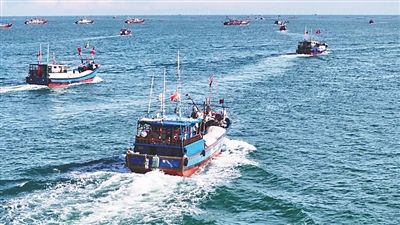 ②8月19日,临高县渔港内渔船缓缓驶出海域,开启新一轮海上捕捞作业。