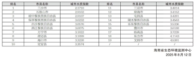 19个市县水环境质量按由好至差排名分别为:三沙市、五指山市、琼中黎族苗族自治县、保亭黎族苗族自治县、白沙黎族自治县、昌江黎族自治县、万宁市、澄迈县、海口市、定安县、三亚市、琼海市、屯昌县、陵水黎族自治县、乐东黎族自治县、儋州市、临高县、东方市和文昌市。详见右表: