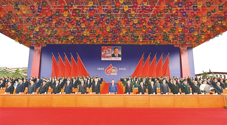 王沪宁发表讲话。他说,1965年9月,在党中央亲切关怀和党的民族政策光辉照耀下,西藏自治区宣告成立。这是西藏发展史上具有划时代意义的大事,巩固了西藏和平解放和民主改革的伟大成果,实现了西藏社会制度的历史性跨越。60年来,西藏经济社会全面发展,民族区域自治制度成功实践,民族团结日益巩固,各族人民生活蒸蒸日上,充分展现了中国共产党领导的坚强力量,充分展现了我国社会主义制度的显著政治优势。