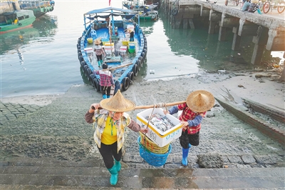 作为海南最大的渔获交易市场之一,南司码头的清晨相当繁忙。像黄芳这样收购海鲜的人不少,她们在当地被称为“渔婆”。每当有渔船靠岸,就会有数十名“渔婆”挑着扁担和箩筐涌上前,查看渔获、帮忙卸货。