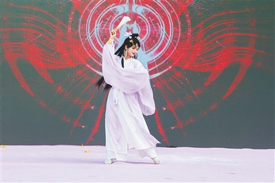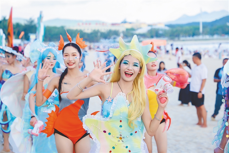 8月9日,大东海沙滩上,穿汉服的姑娘和戴动漫头套的男生击掌,黎族钱铃双刀舞的节奏里,有人跟着蹦跳。