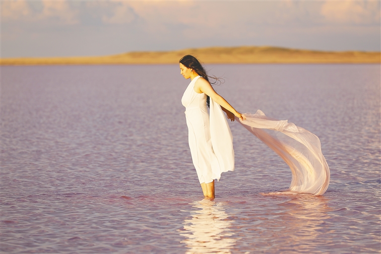 8月23日,游客在哈萨克斯坦阿克莫拉州科贝图兹湖中拍摄艺术照。因湖水中一种微藻在夏季会产生β-胡萝卜素,使湖水呈现出从淡粉色到深玫红色的色彩变化,该湖得名“粉湖”。因旅游承载能力有限和环境问题,科贝图兹湖从2020年起实行封闭管理并进行生态修复,今年夏季重新对公众开放。新华社发