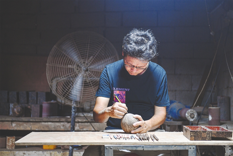 2012年,他又在琼山区玉洲村租下一块地。从荒草丛生的空地到规整的厂房,再到如今的工作室;从最初的独自摸索,到后来有了三五名固定帮手,这,藏着他对椰雕最朴素的坚守。
