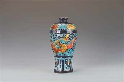 珐华贴金镂空应龙云海纹梅瓶译作“Fahua Meiping with Embellished Gold and Openwork Yinglong(Winged Dragon)amidst Clouds and Waves”。观察这件器物时,不妨留意龙纹的爪子——中国龙的龙爪造型与西方“dragon”的利爪截然不同。整体而言,中国龙以威武、至高无上的形象出现,西方的龙则往往有邪恶的象征意义,所以有些国内的博物馆会在饰有龙图案的瓷器展签上加注:“auspicious Chinese dragon”(吉祥中国龙)。应龙是中国神话中的上古神兽,有翅膀是其最显著的特征。在陶瓷纹饰中,应龙常被描绘成腾云驾雾、展翅高飞的姿态。