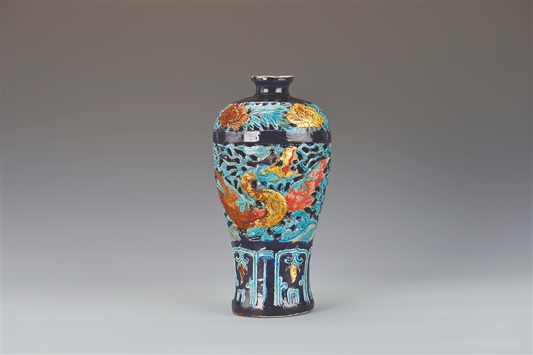 金饰工艺是中国陶瓷艺术的点睛之笔,主要包括贴金、鎏金、描金等。明代瓷器尤其是珐华器上的金饰,十分精美。我们前面提到的珐华贴金镂空应龙云海纹梅瓶,其英文译名中有“embellished gold”(可直译为装饰金,在此梅瓶名中指贴金)。“embellished gold”是一个较为通用的描述性术语,指在器物表面添加金质装饰,强调金饰的装饰功能,不局限于特定工艺。这种翻译选择体现了跨文化交流的灵活性——有时传达视觉效果和文化意义比直译工艺名更有效。