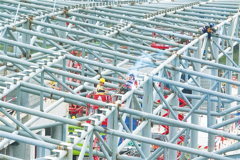 8月27日,在三亚市中国海南国际文物艺术品交易中心和海南国际文化交流中心项目建设现场,工人们在屋面钢架上进行施工。台风后,该项目第一时间排查安全风险,积极推进分步骤、分区域复工复产。海南日报全媒体记者 王程龙 摄