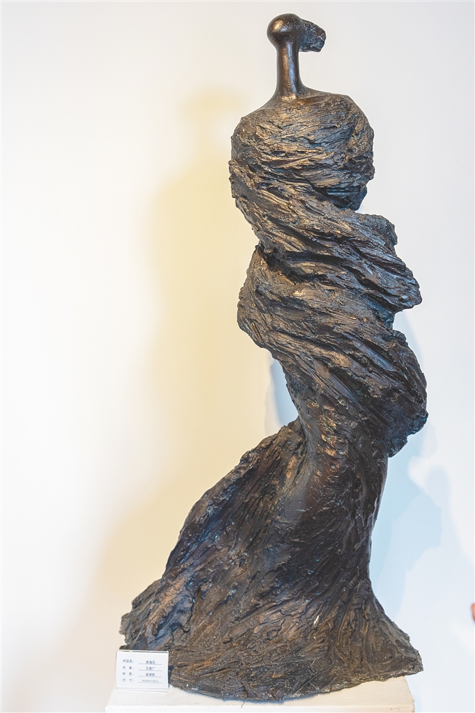 参展作品《南海风》也是一件玻璃钢作品,但和《儿子》的写实风格很不一样。这件作品乍一看是在呈现人像,细看却发现:头不像头,反倒有点像拐杖的把手,飘飘衣袂实则是翻卷着的海浪。这是2010年前后王德广创作的,当时海南迎来新的发展机遇,用什么来表现新海南?王德广在构思阶段苦思良久,却一直想不到最满意的内容。后来在一次散步时,他偶然留意到游客在海边吹着海风拍照。“这种放松的感觉不就是新海南给人的印象吗?”从这一创意出发,王德广用心创作了这件抽象作品,而这件作品也多次被选中参加展览。