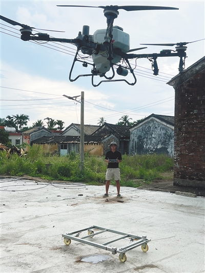 8月28日一大早,文昌文城镇新合村小伙何荣捷开车载着一台大型无人机驶向田野,当天的任务是给邻居家的15亩槟榔地喷洒农药。