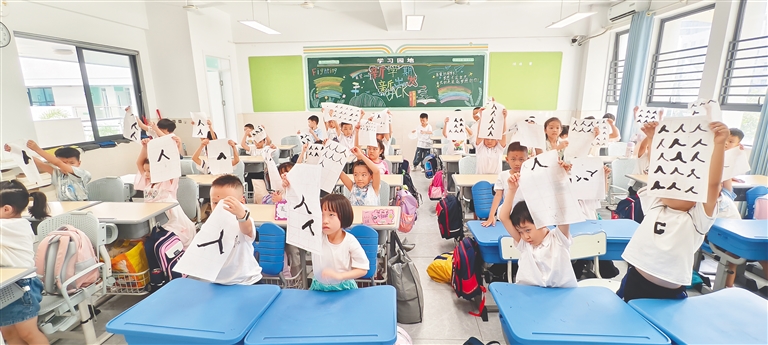 传统文化也成为“开学第一课”中的亮点。在海口市海景学校,孩子们踩着竹竿舞的节拍、听着琼剧的唱腔迎接新学期;三亚市吉阳区丹州小学学生在老师的带领下书写“人”字,一撇一捺间,种下“学做人、会做人”的启蒙种子……
