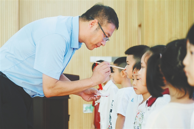 ②万宁市兴隆实验学校举行的一年级新生朱砂点痣仪式。陈先哲 摄