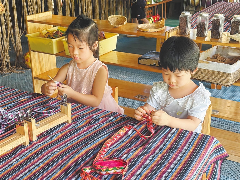 “孩子们经常利用这些材料进行创作,如编织黎锦小挂件、用彩泥塑造黎族文化图案等,在亲手触摸和制作中感受本土文化的魅力。”陆家锐说。
