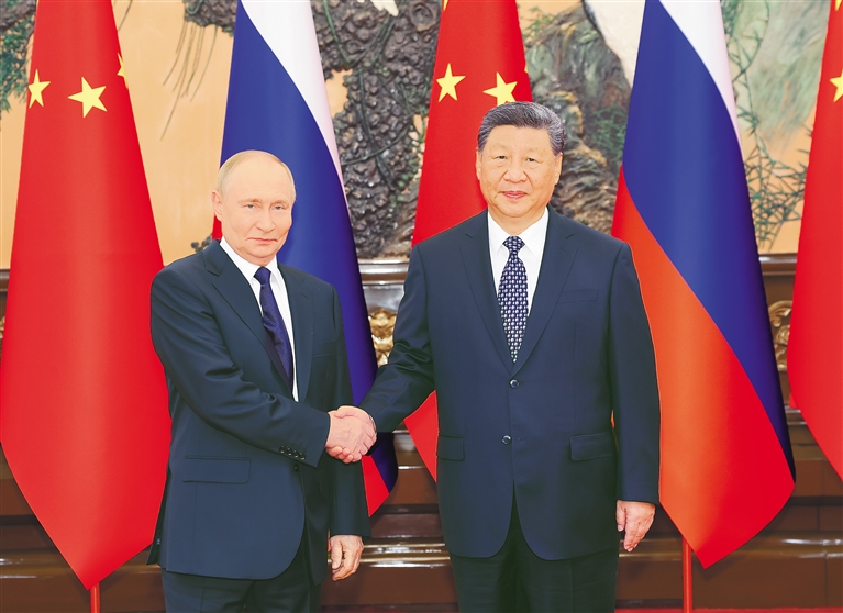 习近平指出,中俄两国元首相互出席对方国家举办的纪念世界反法西斯战争胜利庆典,充分彰显了作为第二次世界大战主要战胜国和联合国安理会常任理事国的大国担当,展示了维护二战胜利成果、捍卫正确二战史观的坚定决心。我提出全球治理倡议,就是要会同所有志同道合国家,坚定捍卫联合国宪章宗旨和原则,推动建设更加公正合理的全球治理体系。中俄两国都强调主权平等、国际法治、多边主义,要继续在联合国、上海合作组织、金砖国家、二十国集团等多边平台加强协作,携手推动构建人类命运共同体。